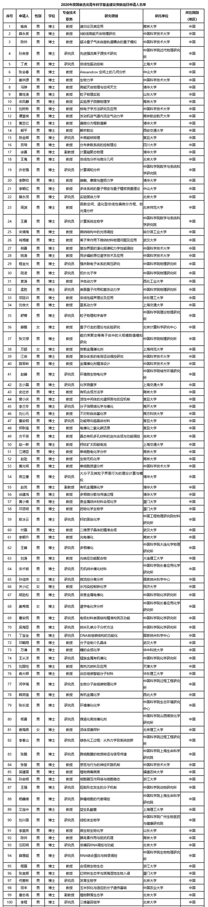 8月11日,国家自然科学基金委员会发布了《2020年度国家杰出青年科学基金建议资助项目申请人名单》。