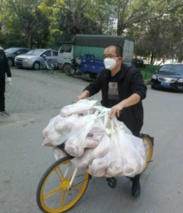 3月7日一整天,王亮帮助业主团购政府10元特价冻猪肉套餐138斤;组织分发超市133人次332份冻猪肉套餐;协助社区配送20元爱心菜200份;组织配送分发10元爱心菜150份。为了便于分发,他用共享单车挂上20多份5斤装的肉,来回跑了4趟。
