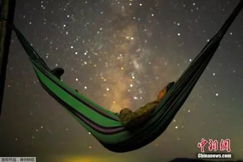 当地时间2018年8月13日,马其顿,科济亚克山一名女孩躺在吊床上,观看英仙座流星雨。