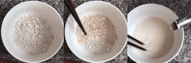 3.加入200毫升刚烧开的沸水,边加边迅速搅拌至透明糊状。
