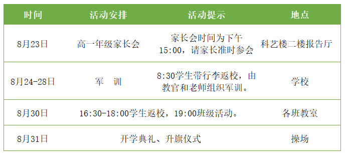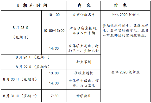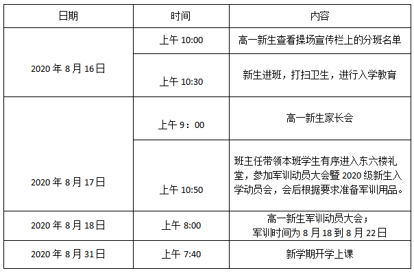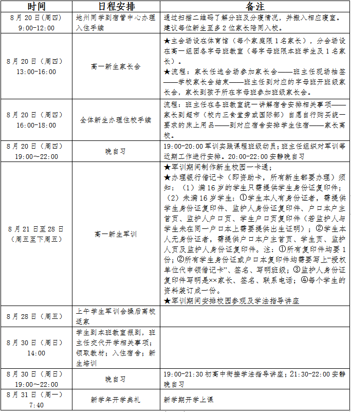 全体高一新生需于8月14日按时到校、报到注册。学生到校后请按校内报到提示在指定地点办理报到注册手续。