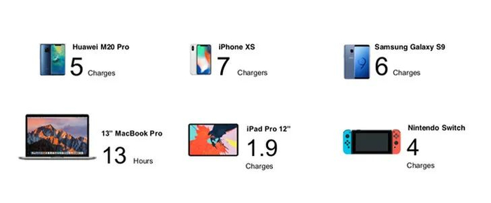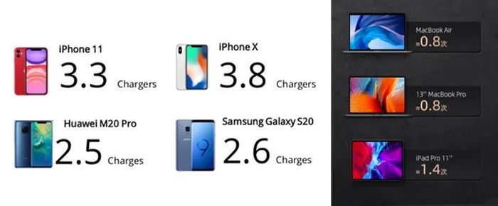 X5这款,满电状态下能分别一次充满近1台MacBook Pro,1.5台iPad Pro,4部iPhone X,2.5部华为M20 Pro;
