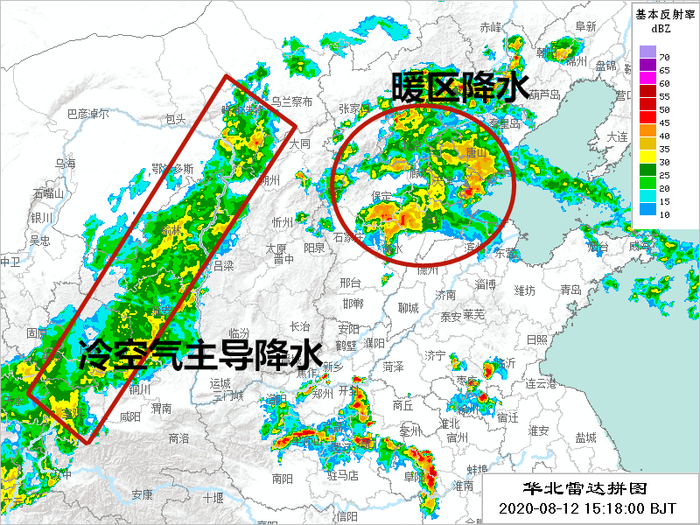 从今天下午15点18分的雷达回波看,西边的一长条是冷空气主导的降雨;影响本市及周边区域的是暖区对流导致的降雨。今天下午本市降雨主要以雷阵雨为主,雨势急但总量不大,且分布不均匀。