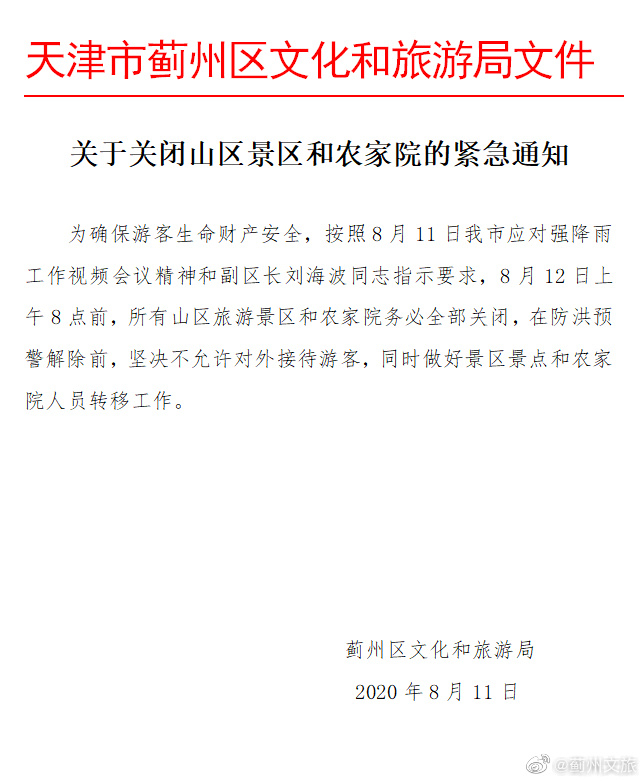 8月11日,蓟州区文化和旅游局已经发出紧急通知,要求所有山区旅游景区和农家院务必全部关闭,并做好人员转移工作,因此,12日蓟州区各山区景区无游客进入,各农家院也做好了住宿游客的劝返和疏散工作。