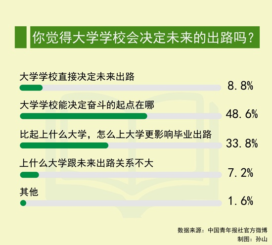 在中青报官方微博的调查中,48.6%的受访者认为大学学校能决定奋斗的起点在哪。一名微博用户留言表示,大学可以开阔一个人的眼界,培养思考能力,但未来的出路如何却不能直接下定论。