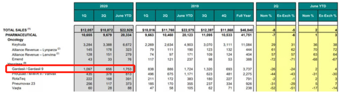 默沙东2020年半年报显示,两款HPV疫苗全球销售额17.53亿