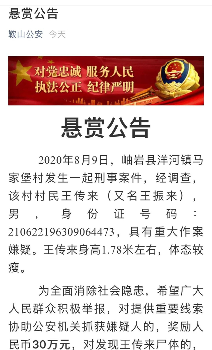 原标题:突发!鞍山警方悬赏30万寻嫌疑人,发现其尸体奖励20万!