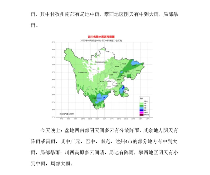 结合四川省气象台天气预报情况和省地质灾害指挥部办公室发布预警提示:8月12日20时~8月13日20时,全省地质灾害气象风险预警结果如下: