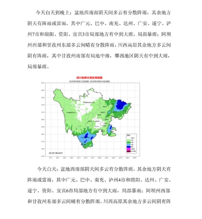 广元、绵阳、德阳、雅安、眉山、乐山、巴中、南充、遂宁、资阳、内江、自贡、宜宾、凉山14市(州)大部,成都东部及西部,泸州西北部局地,甘孜州东南部等地。