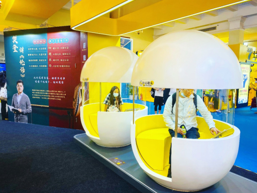 开展首日一大早,“未来自习室”展区就围满了前来参观体验的申城爱书人。以樊登读书的经典黄色为主色调,展区内通过时间胶囊的交通工具、彩虹桥般的道路、睡眠舱体般的卧室等互动装置,构建“在车上、在路上、在家里”三种日常阅读场景,以视听交互的方式呈现,让更多人享受沉浸式阅读体验,打通阅读与日常生活、工作的互动场景。市民杜先生在体验完展区内的视听装置后表示:“时间胶囊真的让我们感受到了未来‘随时随地’的数字化阅读场景,这是爱书人的福音。”