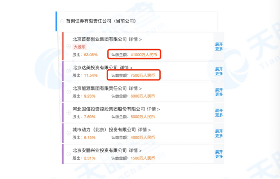 据天眼查APP信息,截至目前,首创证券的控股股东是北京首都创业集团有限公司(下称“首创集团”),认缴金额4.1亿元,持股比例为63.08%;其次是北京达美投资有限公司,认缴金额7500万元,持股比例为11.54%。