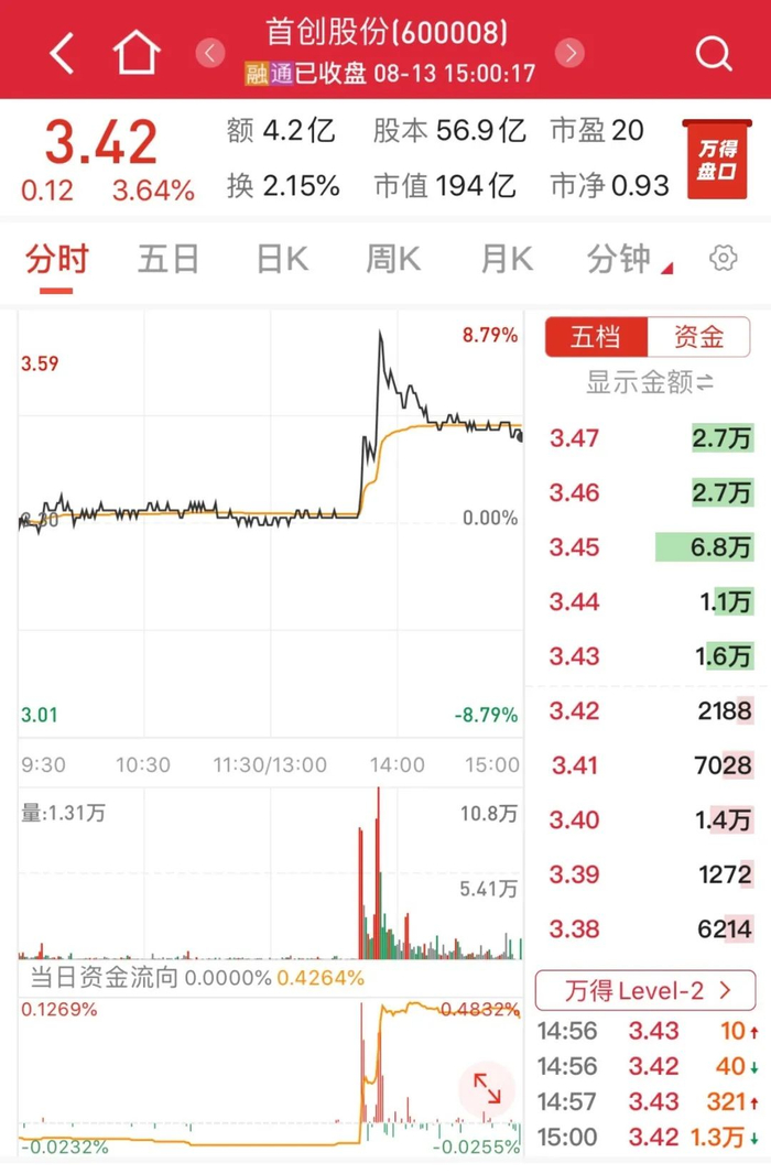 消息一出,第一创业、首创股份的股价出现明显异动,前者快速封上涨停,至尾盘封单尚余20万手。