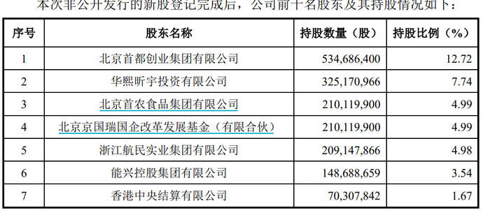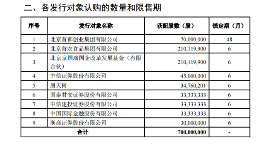 发行对象共有9名,分别为北京首都创业集团有限公司、首农集团、北京京国瑞国企改革发展基金(有限合伙)、中信证券、唐天树、国泰君安、中信建投、中国国际金融股份有限公司、浙商证券股份有限公司。