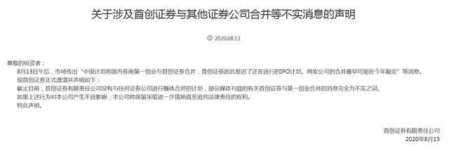 首创证券发布关于涉及首创证券与其他证券公司合并等不实消息的声明称:
