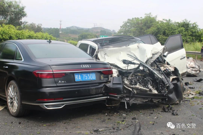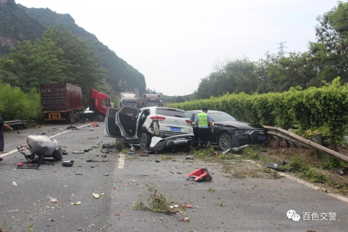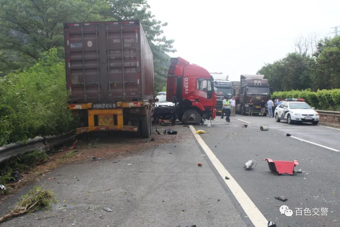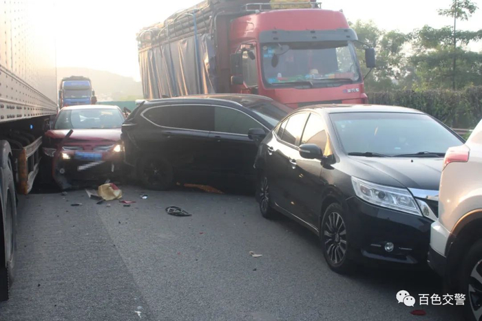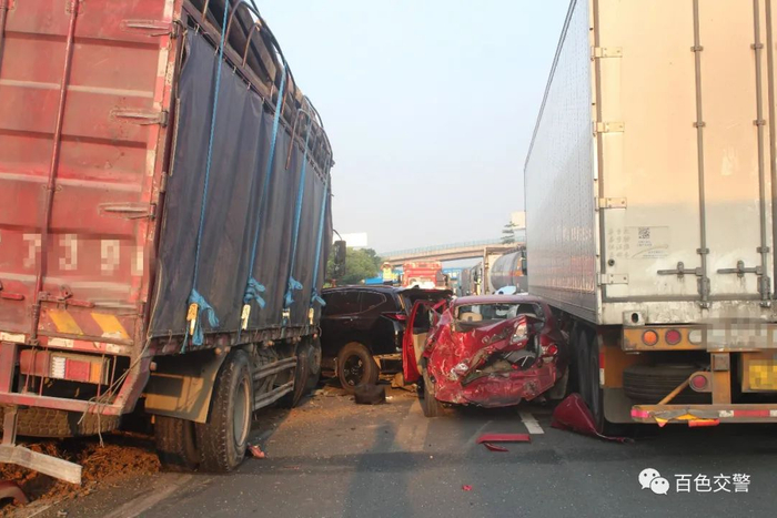 百色交警高速二大队民警赶往现场看到,一辆重型货车横停在高速公路上,车头严重变形,旁边横七竖八地停有不同程度损坏的一辆重型货车、三辆小车,百色往南宁方向的车道都被事故车辆完全占据,交通一度中断。