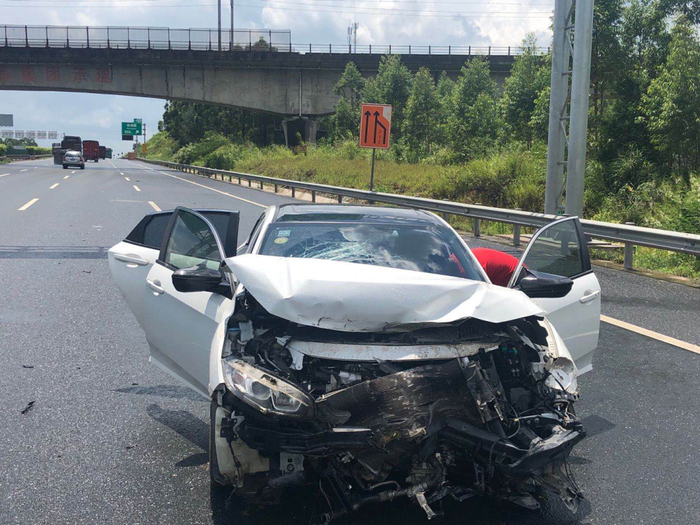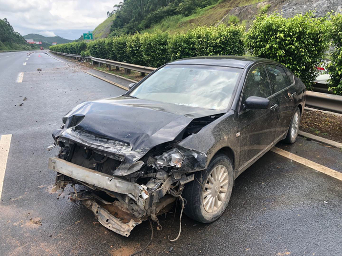 11时,在兰海高速南宁往北海方向2093公里(钦州西收费站附近路段),一辆粤S小车行驶至事发路段时,因车辆打滑撞上中央护栏,巨大的冲击力不仅将中央护栏撞变形,小车也被反弹到路中间,旋转180度,车头“面目全非”。