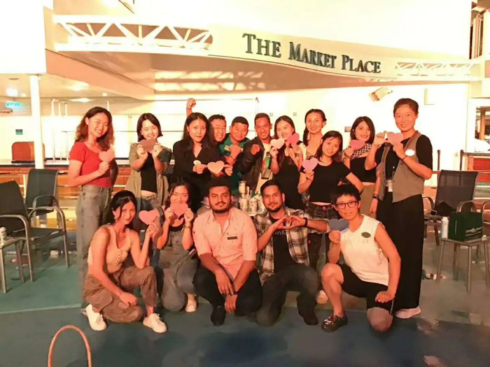 “刚上邮轮,我分不清左舷、右舷,还经常忘记宿舍在哪个楼梯口。各个国家同事的英语口音不一样,还有Ship language (船上用语),上船的第一个星期说得最多的就是‘Pardon me’(请再说一遍)”。但3个月后,她已经可以用带有各国口音的英语和同事无障碍交流,她还会用每个游客所在国家的语言问个好,邮轮环境让她飞速成长。