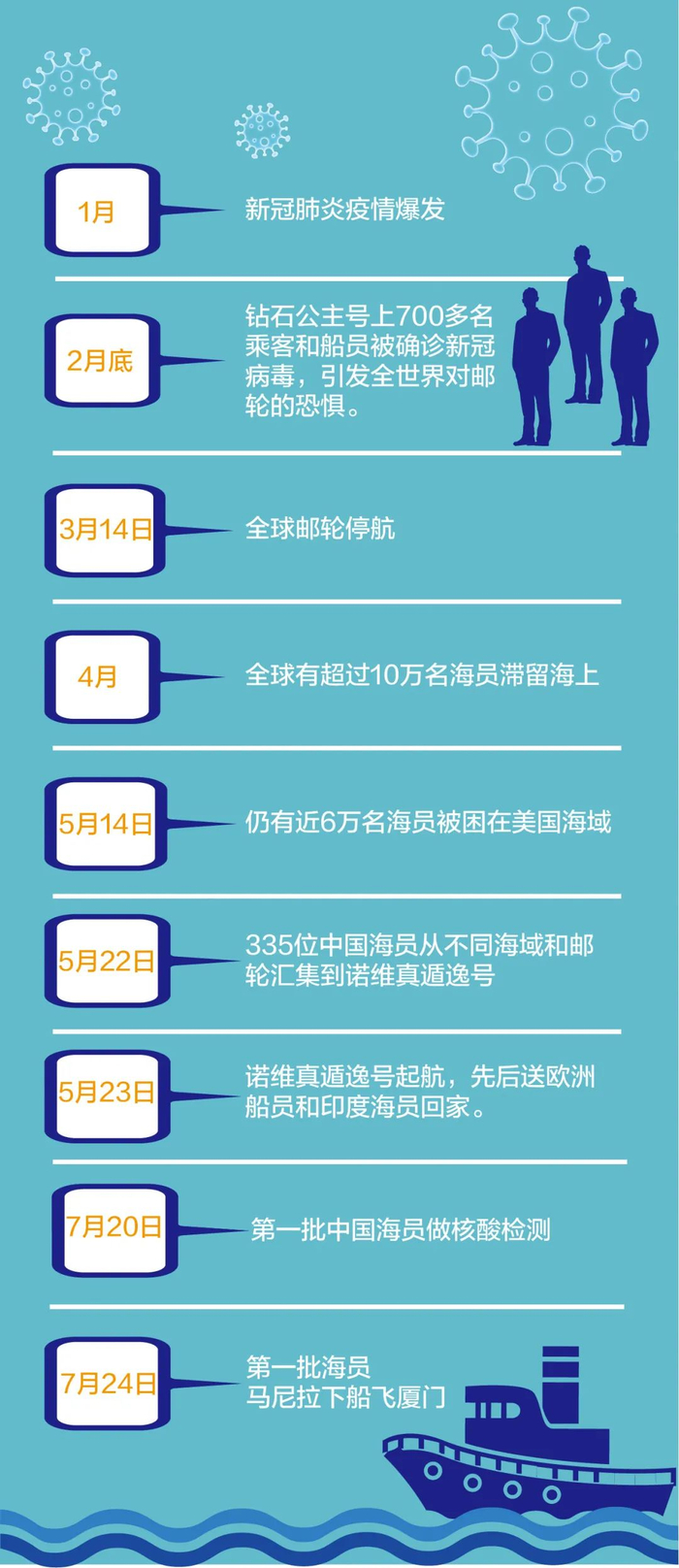 2020年7月24日,104名中国海员在中国厦门港登陆,隔离14天后回到阔别半年多的家。另外231名中国海员需要在邮轮上继续等待回家日期。