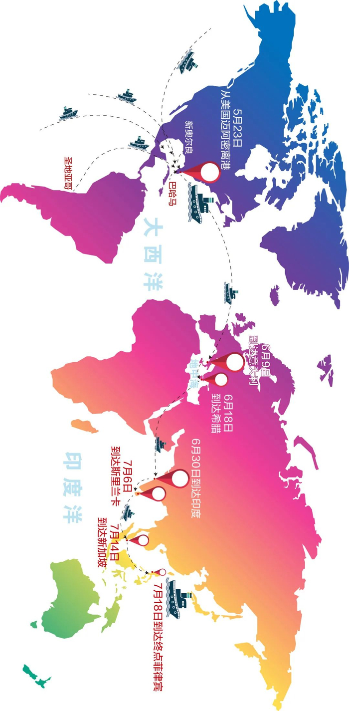 5月23日,这条经过公司几个月的努力、协调的巨大邮轮从美国迈阿密启航开往亚洲航线,穿越大西洋过直布罗陀海峡到地中海,在意大利补给送欧洲船员回家之后靠岸希腊。过苏伊士运河,穿过红海、亚丁湾到印度,送印度海员回家。之后横跨印度洋到马六甲海峡,在新加坡补给,7月18日到达菲律宾马尼拉,之后中国海员分3批从菲律宾乘机到达厦门隔离。