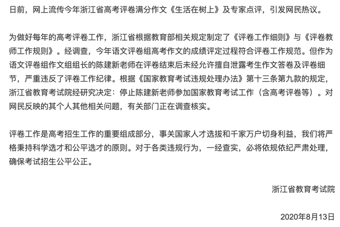 据央视新闻,13日,浙江省通报高考作文评卷相关情况。浙江省教育考试院经研究决定:停止陈建新老师参加国家教育考试工作(含高考评卷等)。
