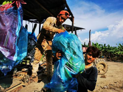 7月16日,在柬埔寨-中国热带生态农业合作示范区内,工人搬运刚刚收获的香蕉。(毛鹏飞 摄)