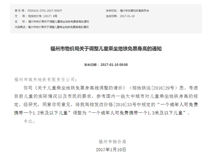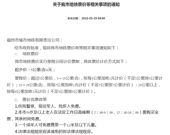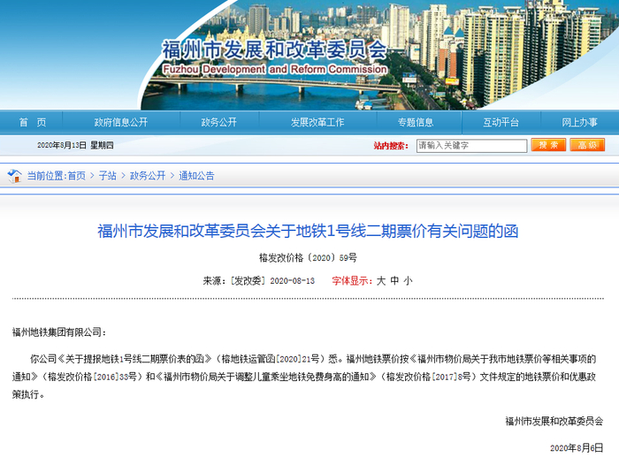 你公司《关于提报地铁1号线二期票价表的函》(榕地铁运管函[2020]21号)悉。福州地铁票价按《福州市物价局关于我市地铁票价等相关事项的通知》(榕发改价格[2016]33号)和《福州市物价局关于调整儿童乘坐地铁免费身高的通知》(榕发改价格[2017]8号)文件规定的地铁票价和优惠政策执行。