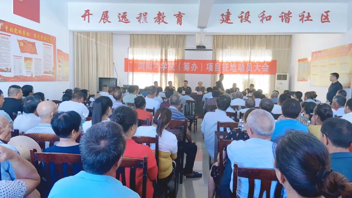 8月13日,浏阳河学院(筹办)项目征地动员大会在普迹镇新街村召开。校方代表、浏阳市拆迁办、乡镇相关负责人以及新街村村民代表约140人参与了会议。