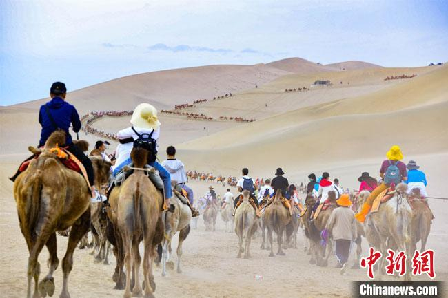 8月11日,游客骑骆驼畅游鸣沙山,观赏大漠如画美景。 王斌银 摄