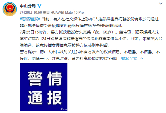 7月24日,一女子朱某英(女,68岁)在社交媒体上散布“大连凯洋世界海鲜股份有限公司通过非正规渠道接受带疫俄罗斯籍船只海产品”等相关虚假信息。7月25日,朱某英因涉嫌编造、故意传播虚假信息罪被辽宁大连中山警方依法刑事拘留。