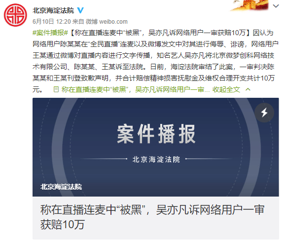 2017年12月16日,王某在微博账号中发表文章,公然散播“流量小鲜肉吴亦凡约粉还假装谈恋爱”等对原告进行侮辱、诽谤的内容。经查,上述侮辱、诽谤内容源于前一日陈某某在直播中与用户连麦时所谓“爆料”。而后,吴亦凡就二人侮辱诽谤一事向法院提起起诉。2020年6月10日,北京海淀法院发布案件审结情况:一审判决陈某某和王某刊登致歉声明,并合计赔偿精神损害抚慰金及维权合理开支共计10万元。