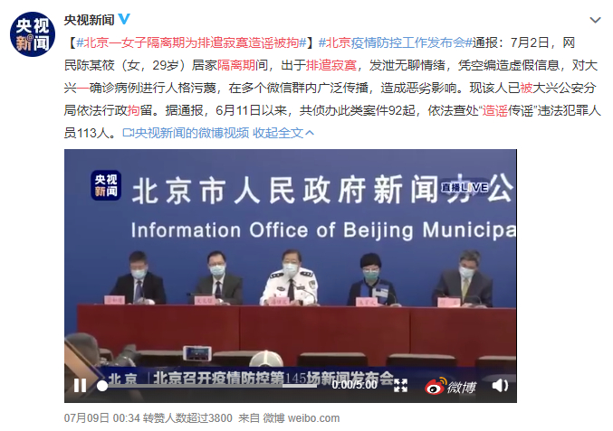 7月2日,北京一女子陈某(女,29岁)居家隔离期间为排遣寂寞、发泄无聊情绪,凭空编造虚假信息,对北京大兴一起确诊病例进行人格污蔑,在多个微信群中广泛传播,造成恶劣影响。随后,被北京大兴警方依法行政拘留。