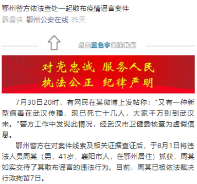 7月30日,湖北省襄阳市一男子周某(男,41岁,在鄂州居住)在微博散布消息称:“又有一种新型病毒在武汉传播,现已死亡十几人,大家千万别到武汉来。”经武汉市卫健委核查为虚假信息。8月1日,湖北鄂州警方依法对周某处以行政拘留7日的处罚。