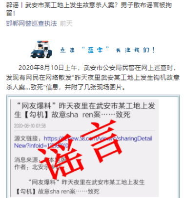 8月10日,河北省武安市一男子郭某某(男,28岁)在网上散发“昨天夜里武安某工地上发生钩机故意杀人案致死”信息,并附了几张现场图片。经警方调查核实,该市未发生该警情,该信息为谣言。经进一步核实,真实情况为2020年8月8日湖北襄阳发生的一起命案。随后,河北武安警方依法对郭某某处以行政拘留10日的处罚。