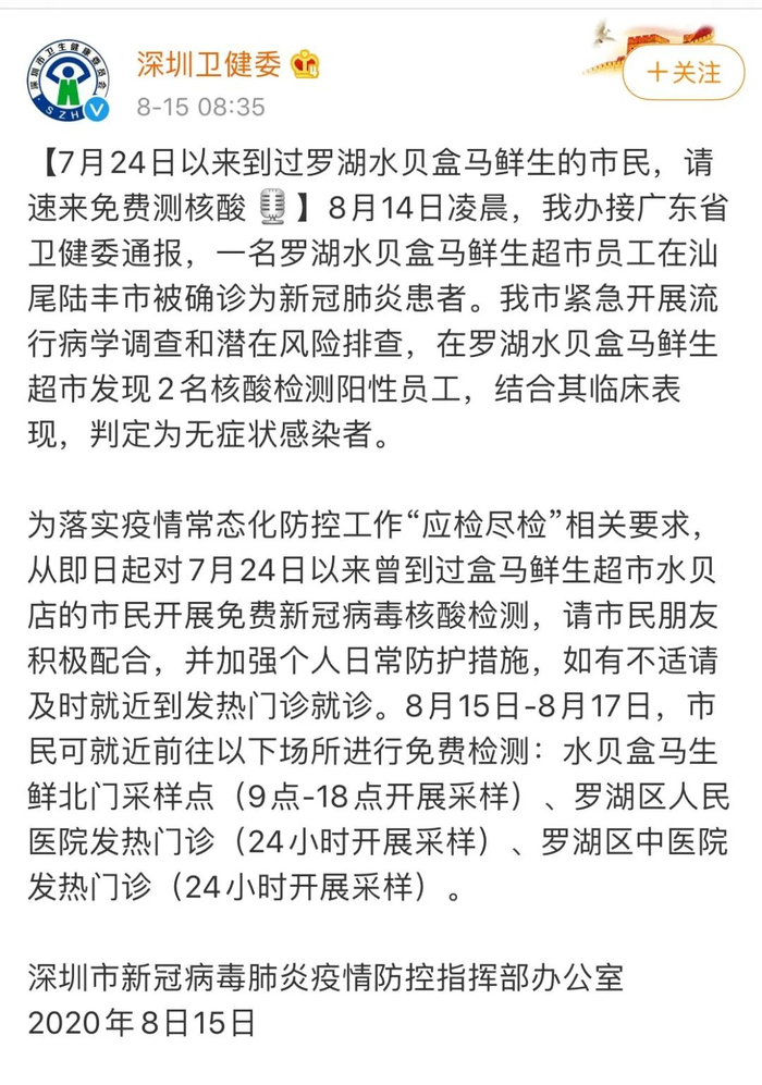 8月15日,深圳市新冠病毒肺炎疫情防控指挥部办公室发布通告:8月14日凌晨,该办接广东省卫健委通报,一名罗湖水贝盒马鲜生超市员工在汕尾陆丰市被确诊为新冠肺炎患者。深圳市紧急开展流行病学调查和潜在风险排查,在罗湖水贝盒马鲜生超市发现2名核酸检测阳性员工,结合其临床表现,判定为无症状感染者。