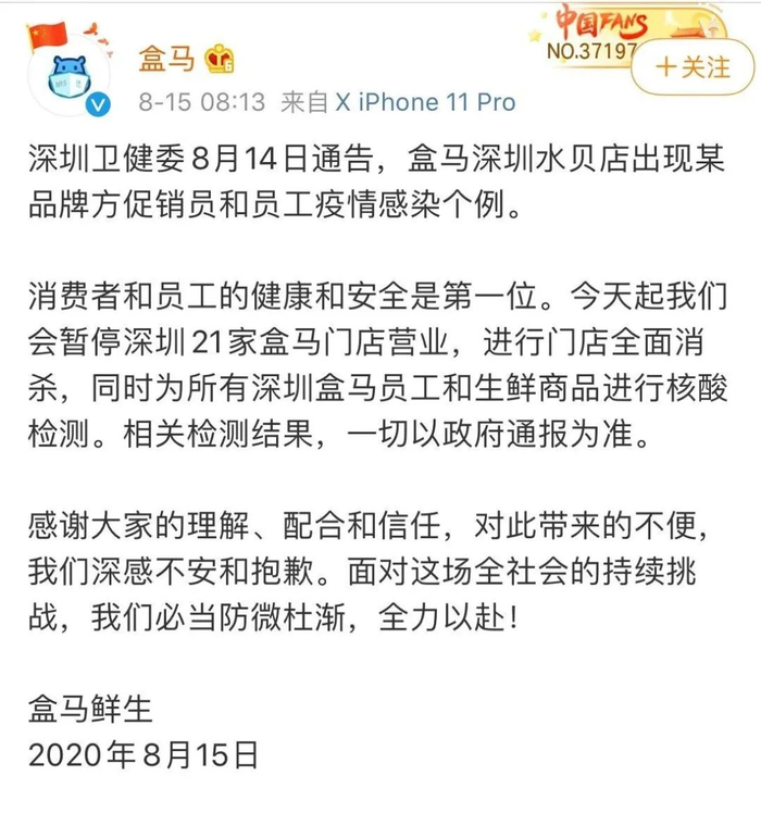 今天,@盒马 发布:深圳卫健委8月14日通告,盒马深圳水贝店出现某品牌方促销员和员工疫情感染个例。今起,盒马会暂停深圳21家盒马门店营业,进行门店全面消杀,同时为所有深圳盒马员工和生鲜商品进行核酸检测。