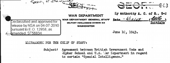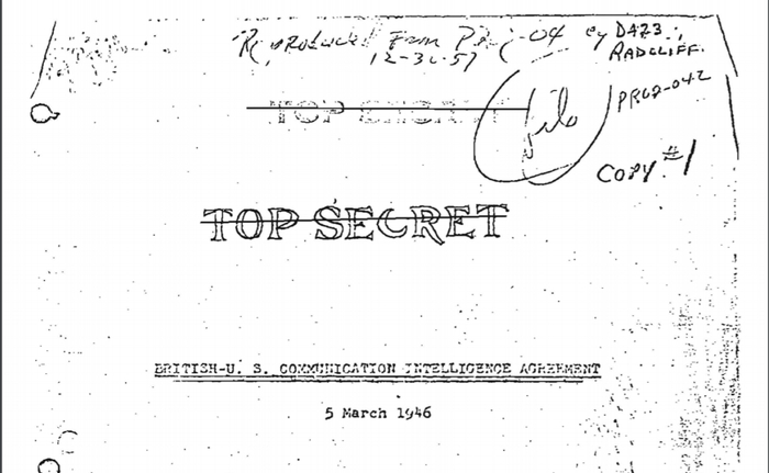 1946年3月5日,在丘吉尔铁幕演说当天,英美两国签订了《英美通信情报协定》(简称UKUSA)。协议规定两国之间可以交换任何有关“外国”的情报。