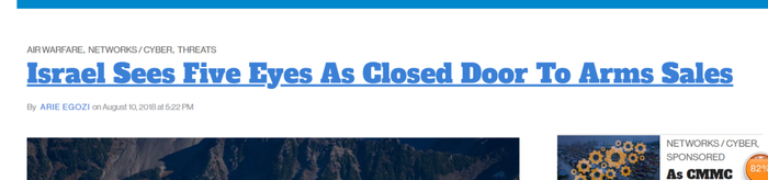 “五眼联盟”经常做超出自己职责范围的事,干涉军工贸易就是其中之一。美国的“最新防务网站”(Breakingdefense)曾在2018年刊登了一条报道称,以色列把“五眼联盟”视为军售的封闭门。
