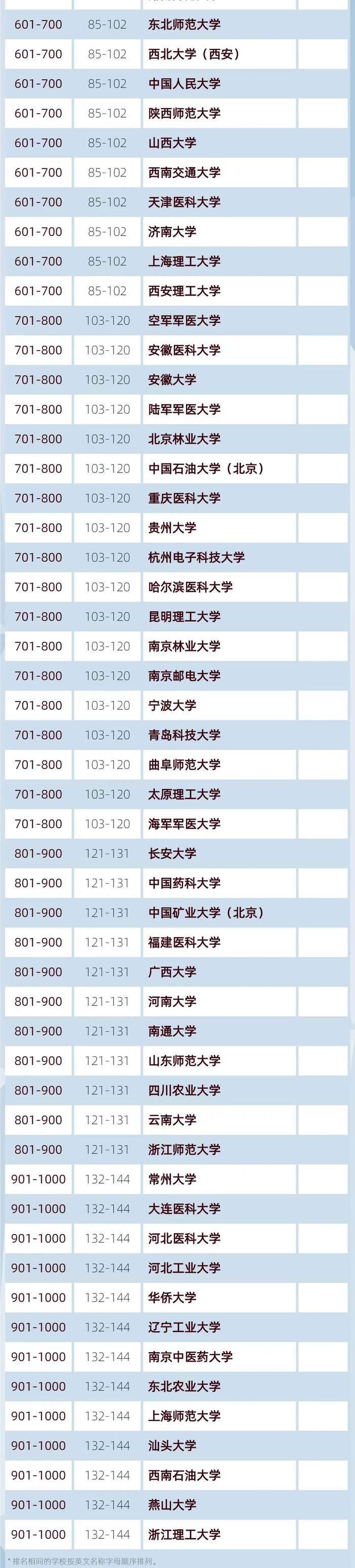 此外,福建师范大学、上海理工大学、西安理工大学、青岛科技大学、曲阜师范大学、中国矿业大学(北京)、河北工业大学、辽宁工业大学、南京中医药大学、东北农业大学、上海师范大学、西南石油大学、浙江理工大学这13所大学首次入围全球1000强。
