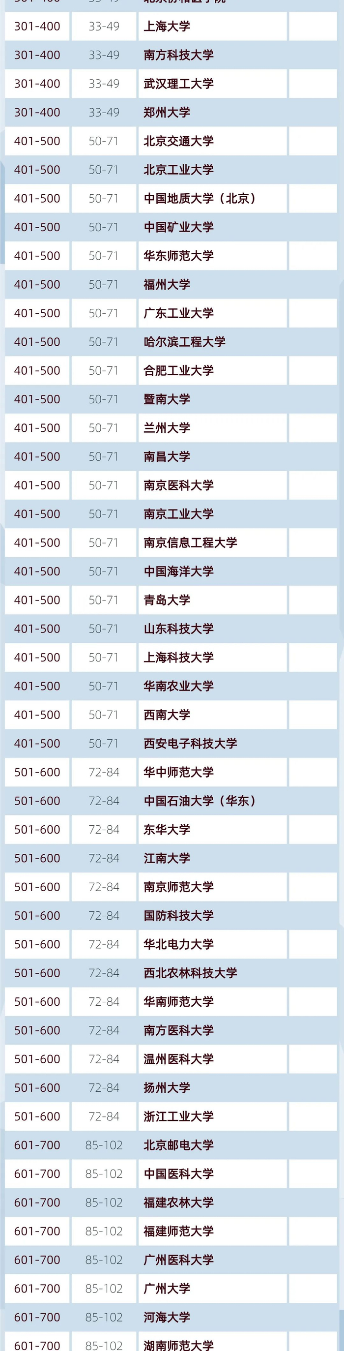 入围全球500强的中国内地高校中,“双一流”高校占据绝对优势,71所中60所为“双一流”高校,其中哈尔滨工业大学、中南大学、南京大学、东南大学、西安交通大学排名均有所上升,与华中科技大学、中山大学共同排在全球第101-150名。北京航空航天大学、吉林大学、山东大学、华南理工大学、天津大学首次进入全球前200。北京理工大学、湖南大学、西北工业大学、北京科技大学首次进入全球前300。北京交通大学、北京工业大学、中国地质大学(北京)、中国矿业大学、合肥工业大学、西南大学、西安电子科技大学这7所“双一流”高校首次入围全球500强。