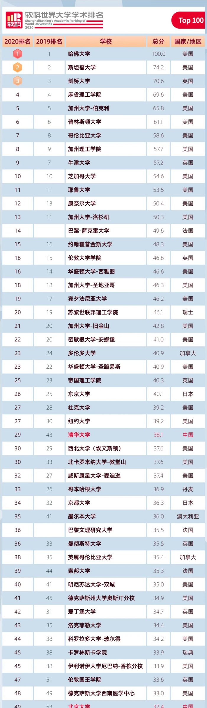 在今年的排名中,哈佛大学仍然稳占鳌头,连续第18年蝉联全球第一,斯坦福大学紧随其后,位列第三的是剑桥大学。哥伦比亚大学和加州理工学院排名均上升1位,依次位列全球第七和第八。