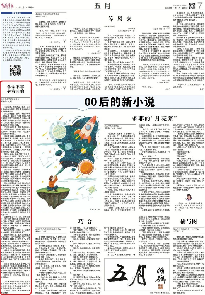 原来,这篇2020上海中考现代文阅读理解题的原文《念念不忘,必有回响》选自中国青年报“五月”文学版第二期“00后的新小说”,该文章作者为兰州大学管理学院19岁学生王皓铎。