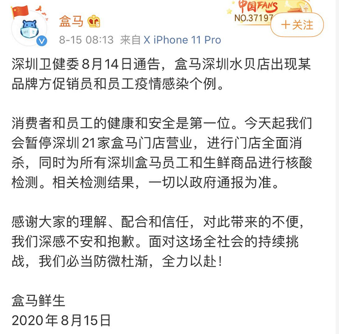 8月15日,盒马鲜生发出公告称,深圳所有门店暂停营业,进行全面消杀。