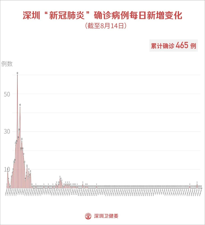 截至8月14日24时,深圳市累计报告新冠肺炎确诊病例465例。目前在院3例。