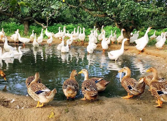 梨园里散养着可爱鸭和大白鹅,不仅是除草除虫小能手,还能给梨树提供天然的生态肥料呢!