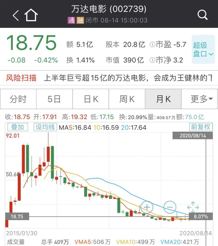 与现金流危机同至的,是股价问题,鉴于华谊兄弟高质押率,这涉及到公司控制权。2018年以来,华谊兄弟股价一路下跌,最新收盘价仅为4.77元。公司市值从巅峰时期的800亿元缩减至如今的105.5亿元,减幅超八成。6月的公告显示,华谊实控人王忠军、王忠磊合计质押占其所持股份比例达到93.42%。这意味着,实控权危机,一直没有减少。
