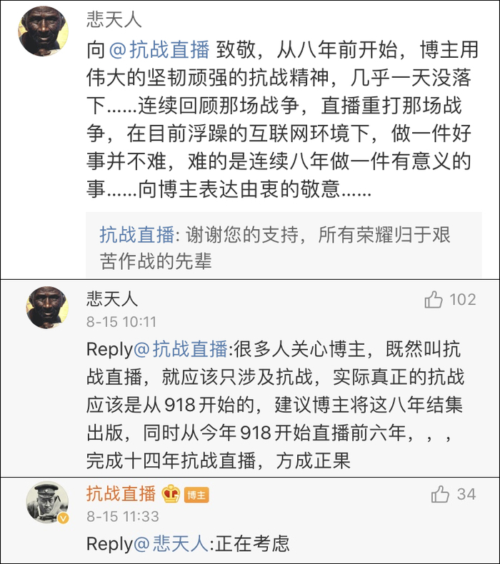 同时,该微博账号也表示正在考虑,要不要再“直播”1931年-1937年这6年的抗战进程,毕竟,从“九一八事变”开始,中华民族的局部抗战已经打响,“14年抗战”才是中国抗日战争的完整历史。