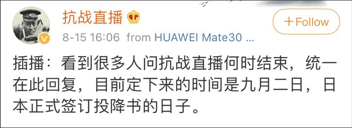 该微博账号称,目前停止更新的时间暂定为9月2日,即1945年9月2日,日本外相重光葵在美国军舰密苏里号上正式签署投降书的日子。