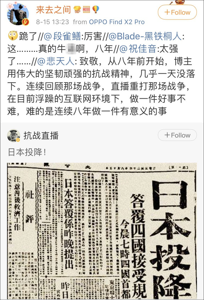 “辛苦了博主!终于等到了这一天!”“您的微博是一部很棒的历史书”……网友们感叹道,在关注博主的8年里,他们切身地感受到了前辈们抗战的艰辛。