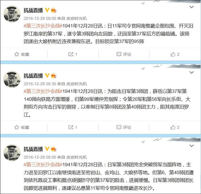 当年12月28日,该微博账号还“直播”了紧张的第三次长沙会战的战况。这场战争的胜利,沉重地打击了日本侵华军队,粉碎了日本消灭中国军队主力、“以战迫降”的战略目标,振奋了全国人民抗战胜利的信心。