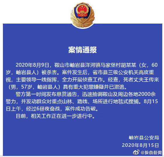 8月15日,辽宁省鞍山市公安局官方微博发布案情通报,2020年8月9日,鞍山市岫岩县洋河镇马家堡村胡某某(女,60岁,岫岩县人)被杀害。经查,死者丈夫王传来(男,57岁,岫岩县人)具有重大犯罪嫌疑并已潜逃。警方第一时间发布悬赏通告,迅速抽调鞍山及周边各地2000余警力,并发动群众对重点山林、路线、场所进行地毯式搜捕。8月15日上午,经过6昼夜奋战,案件成功告破。目前,相关工作正在进一步进行中。(人民网)
